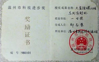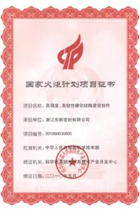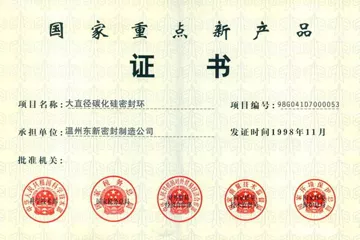 國家火炬計劃項目證書(項目名稱:大口徑碳化硅密封環編號:98D231D7000263)國家重點新產品證書(項目名稱:大口徑碳化硅密封環編號:98G041D7000053)